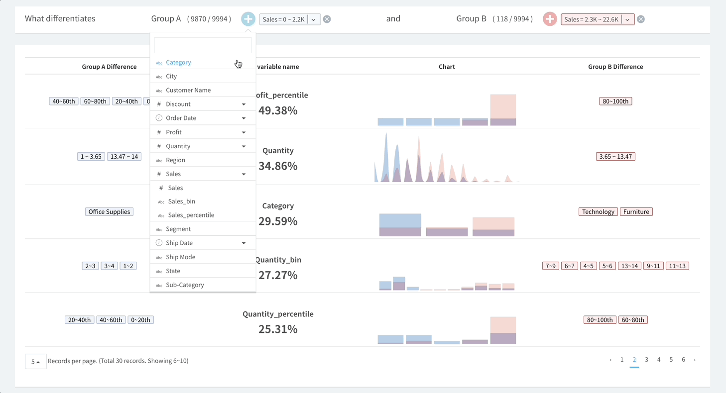3. **Statistical Characteristics of Group A/B**: This displays the variable value (range) where a specific group has a relatively higher ratio than the other group. \