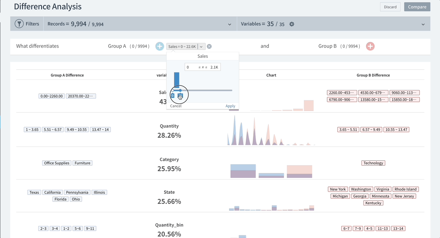 \&#xNAN;*\*In the example screen above, the 'Profit' in the 484.9\~3919.99 range shows the 'higher profit group' exists at a higher ratio than the 'lower profit group'.*
