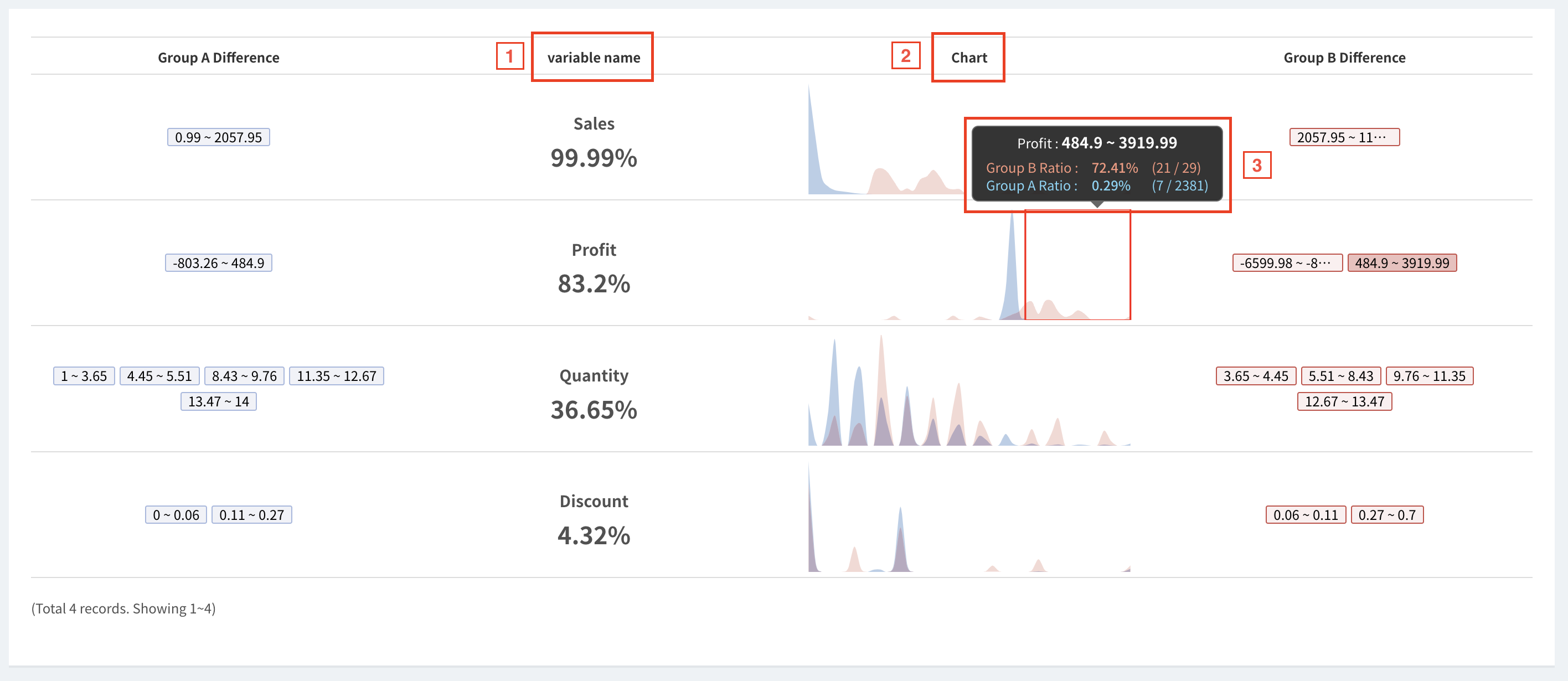 1. **Variable Name**: The name of the variable explaining the differences between the two groups and the statistical difference are shown in percentages. In the illustration above, the second variable, 'Profit', with a value of 72.41%, means that when comparing the 'Profit' distribution between the two groups, if the entire distribution area is considered 100, then the **non-overlapping distribution area** is 72.41%. Put differently, *the larger this number, the better it represents the statistical difference between the two groups*.&#x20;